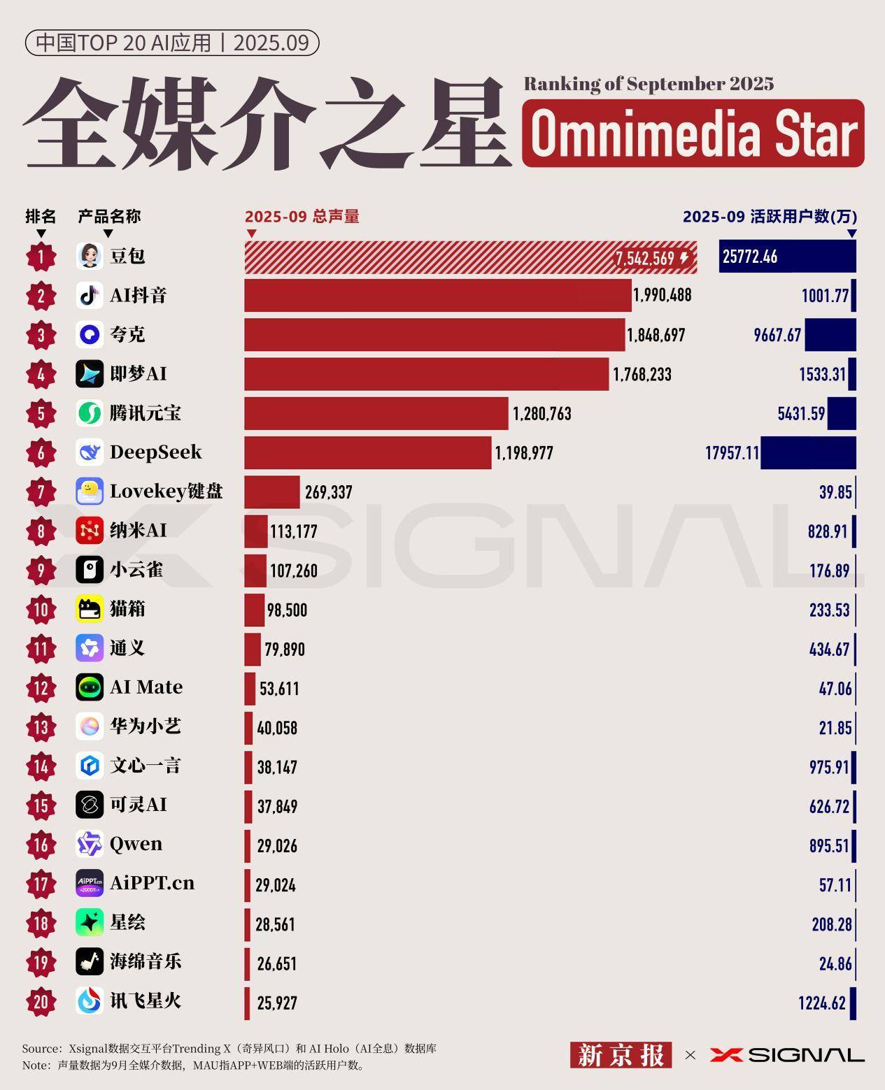 开云体育[永久网址:363050.com]成立于2022年在中国,是华人市场最大的线上娱乐服务供应商而且是亚洲最大的在线娱乐博彩公司之一。包括开云、开云棋牌、开云彩票、开云电竞、开云电子、全球各地赛事、动画直播、视频直播等服务。开云体育,开云体育官方,开云app下载,开云体育靠谱吗,开云官网,欢迎注册体验!10月18日,新京报AI研究院与Xsignal联合发布2025年9月“全媒介之星”中国TOP 20 AI应用榜单。本榜单根据AI应用的全媒介声量梳理出了2025年9月排名前20的国内AI应用,并同时统计了应用的MAU(月活跃用户)数据。从这两项数据的对比,可以窥见国内AI应用发展趋势。